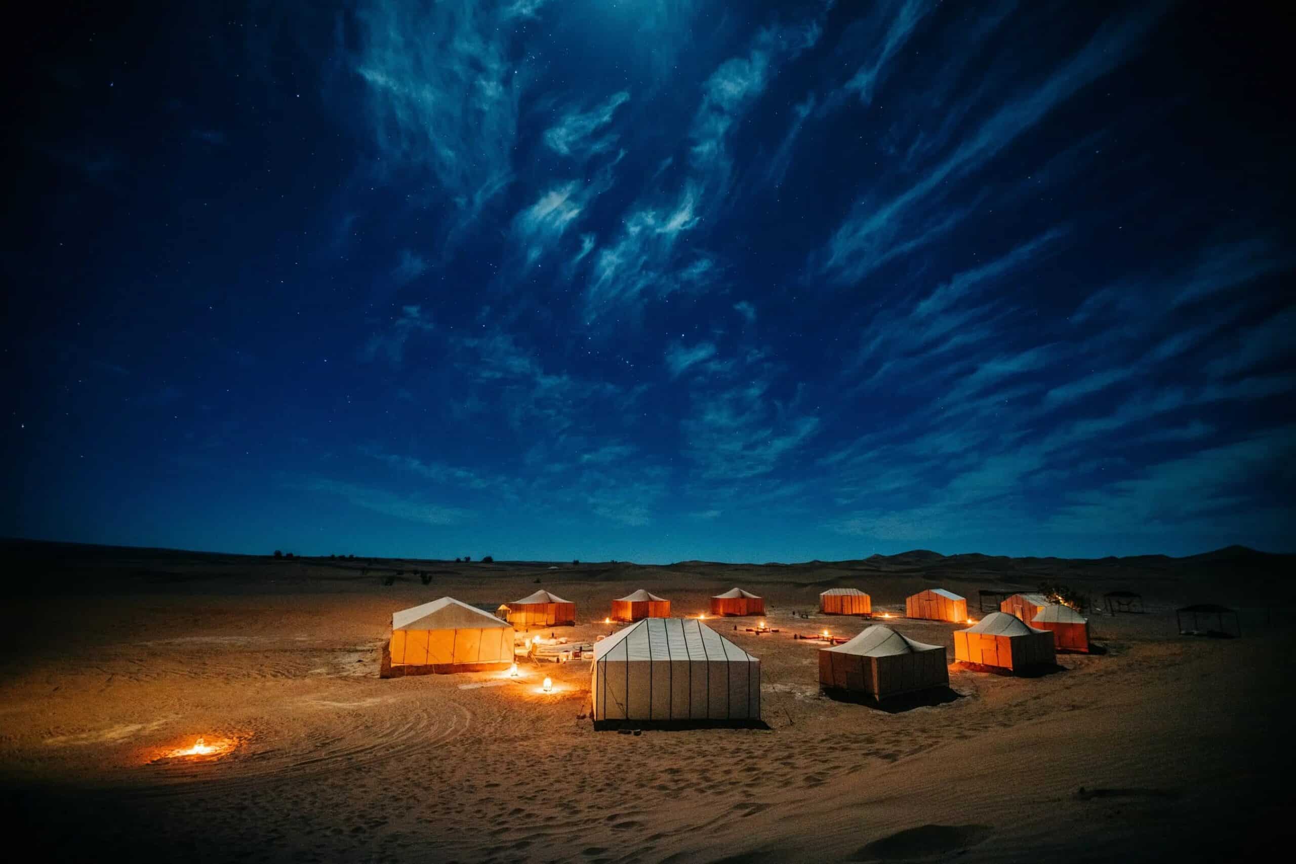 Next, head towards Erfoud, a town known for its fossil workshops and the entrance to the Sahara Desert. From there, drive to Merzouga, the gateway to the Erg Chebbi Dunes. Upon arrival, you’ll mount camels for a camel trek through the dunes, experiencing the stunning Sahara sunset as the dunes change color. Your trek will lead you to a traditional desert camp, where you’ll enjoy a delicious Moroccan dinner, listen to Berber music around the campfire, and sleep under the stars.